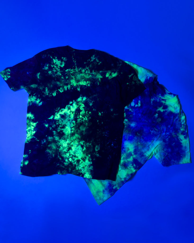 Dyed with the only true fluorescent fiber reactive dye available. Patented and utilizing a rare chromophore, this dye glows when exposed to UV light. Perfect for nocturnal adventures. Get both the Limelight Ice Dyed T-shirt and the Firefly Crystal Dyed T-shirt for the ultimate glow pack. All shirts are dyed to order and ship on average between 2-5 business days after you've placed your order. If ordering for Halloween, you must place your order by 10/24.