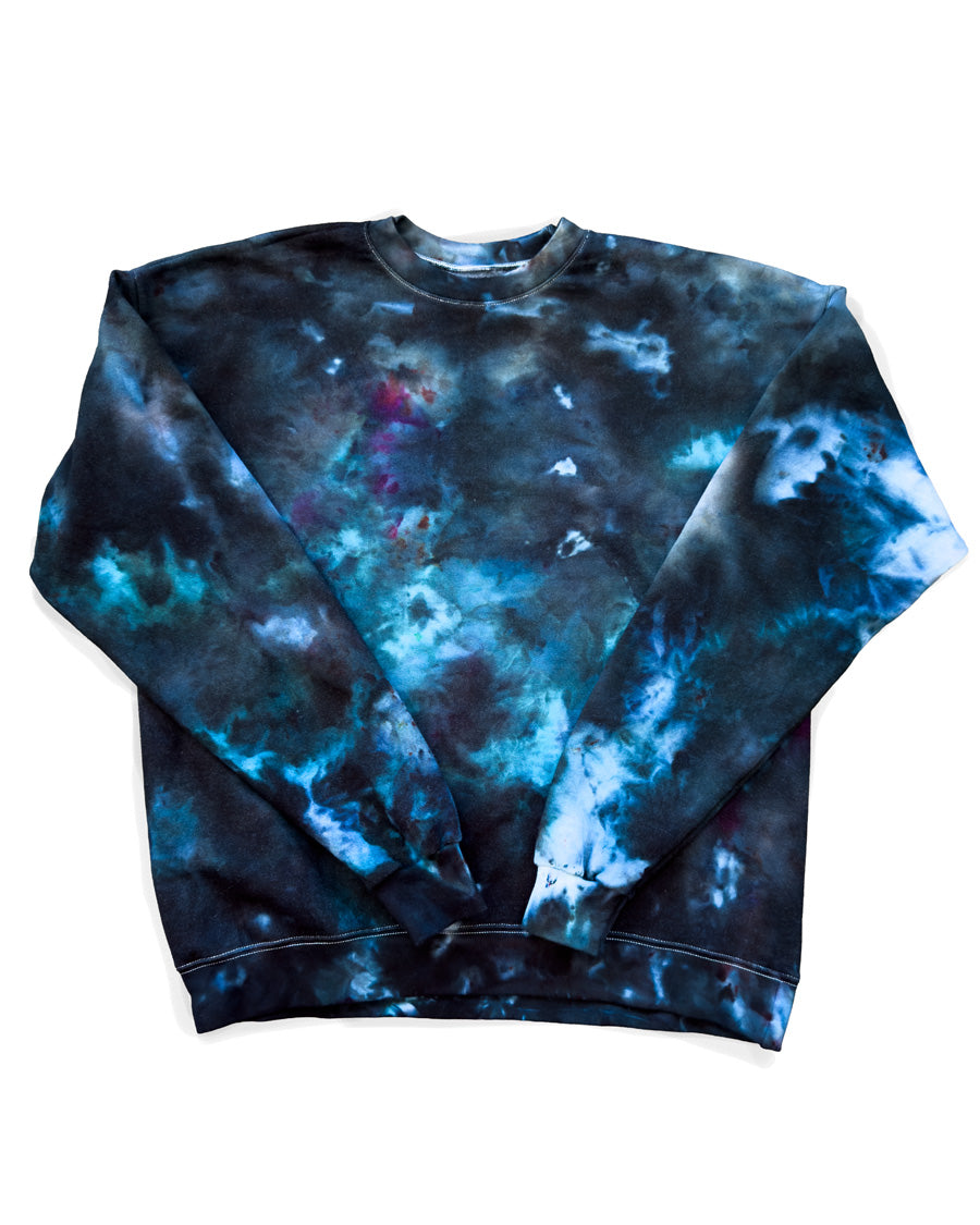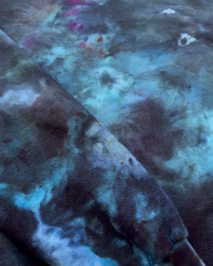 This soft sweatshirt is ice dyed by hand in our LA studio, one piece at a time, making every one a unique expression of pigment and water.  Designed for every day wear, the plush 8 oz weight is perfect for layering.  Night Swimming is inspired by nocturnal adventures (and an unforgettable song from our youth), and the vision of light breaking through the inky shadow of moonlit water. Unisex fit. Please note your sweatshirt will be dyed with the same pigments and technique as the one in the photo, but will manifest its own one-of-a-kind pattern.