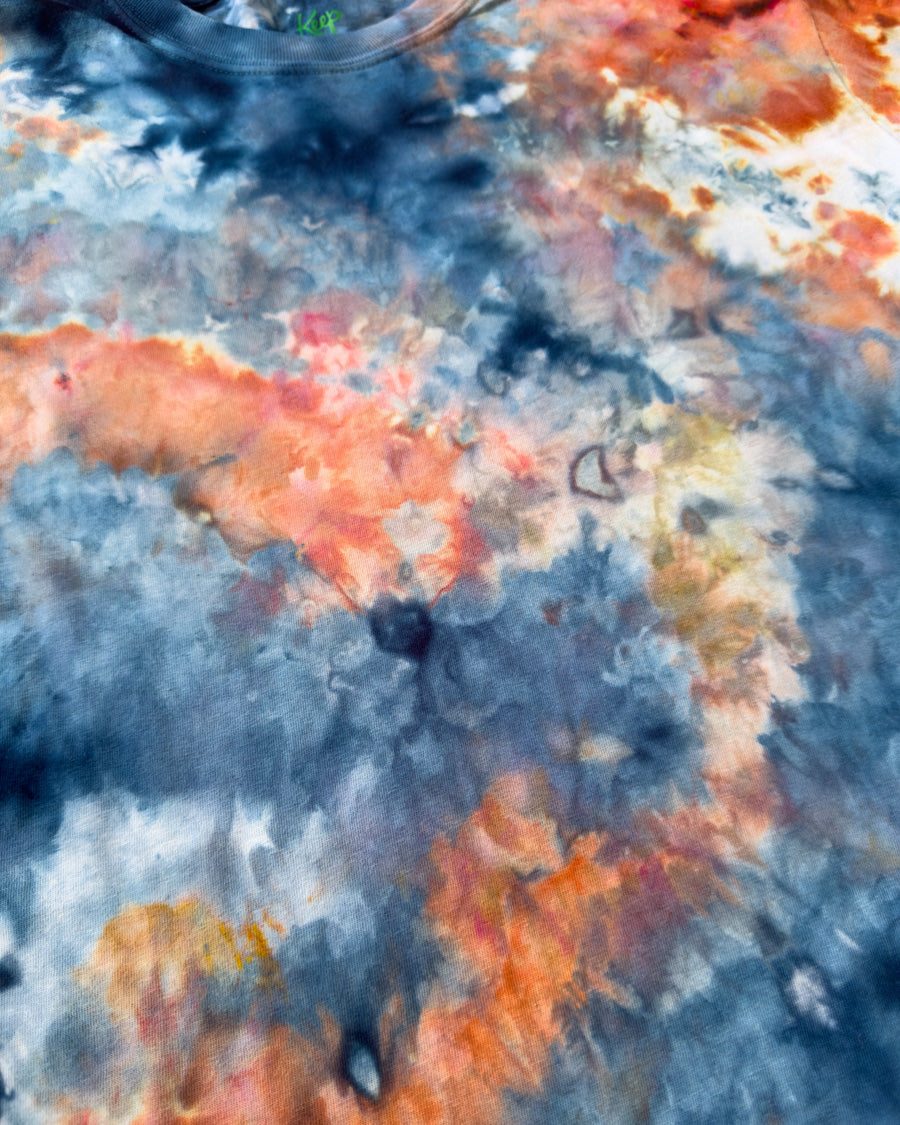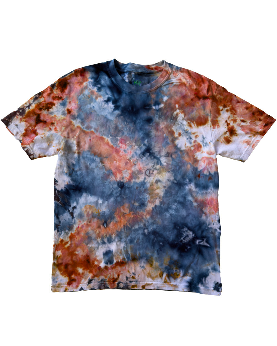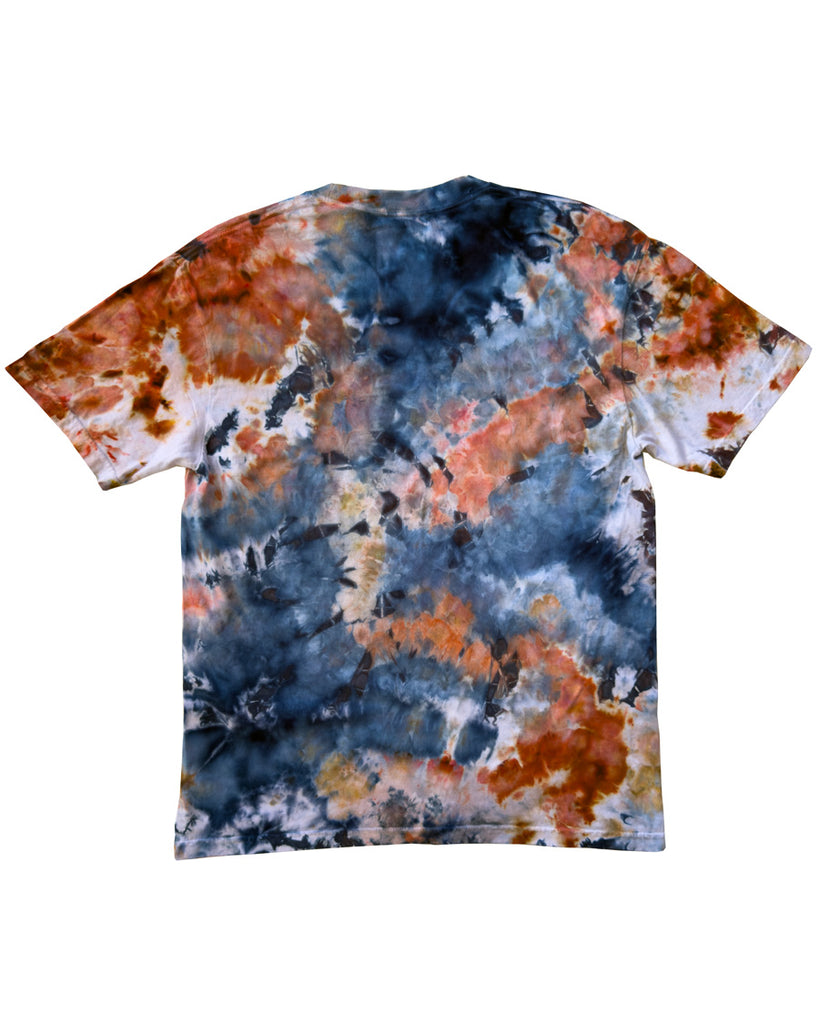 Terracotta and cobalt earth tones blend in agate-like formations. Our ice dyed shirts showcase unique melting patterns. Each shirt is dyed with the same colors but the ice does its thing and makes every shirt one-of-a-kind. Your shirt will look similar to the one pictured but it WILL NOT be exactly the same. Unisex fit, heavyweight t-shirt. All shirts are dyed to order and ship on average between 2-5 business days after you've placed your order.